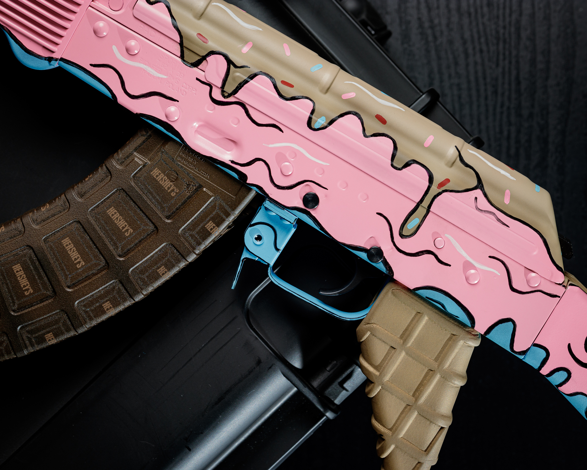 An AK cerakoted to look like a dripping ice cream cone, with waffle cone pistol grip and Hershey chocolate magazine